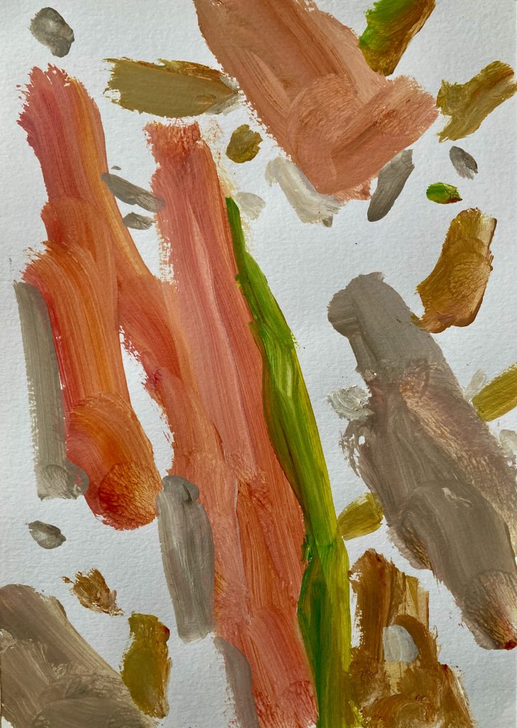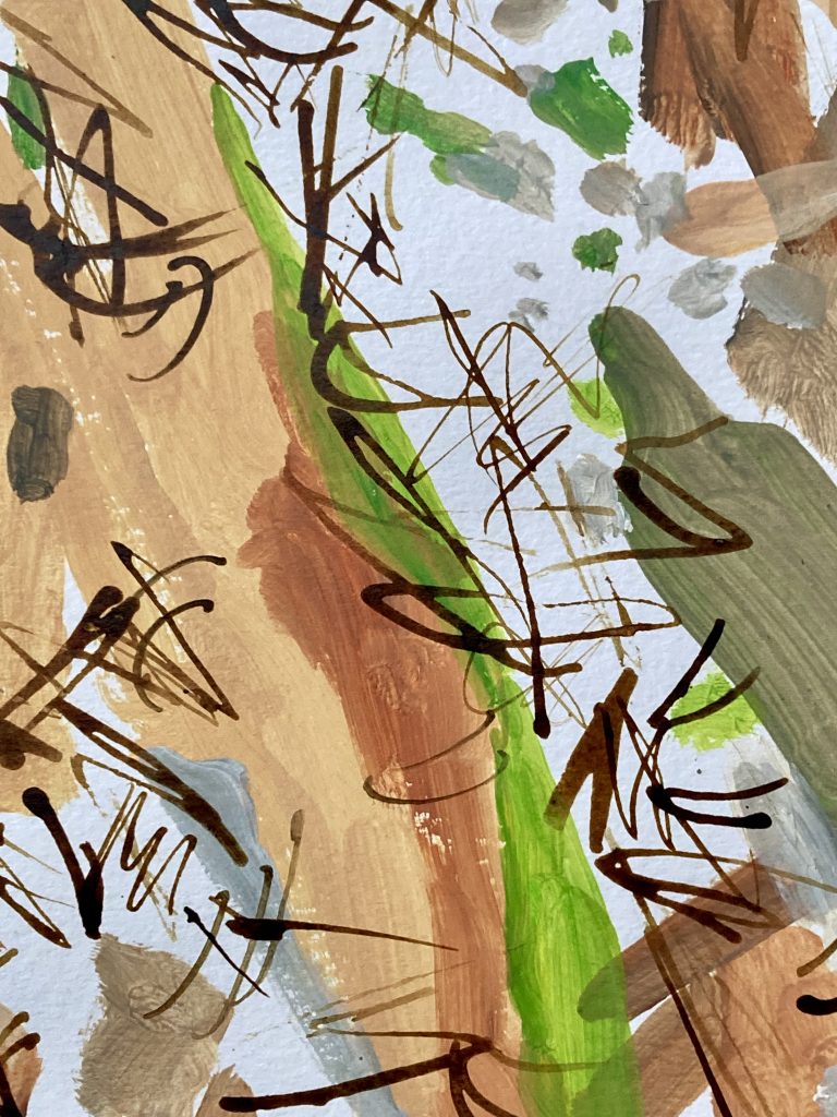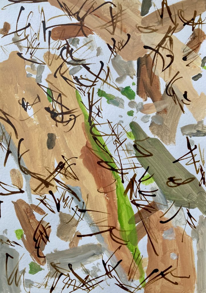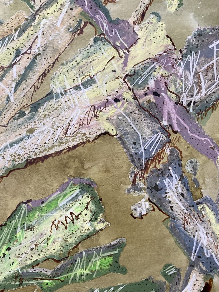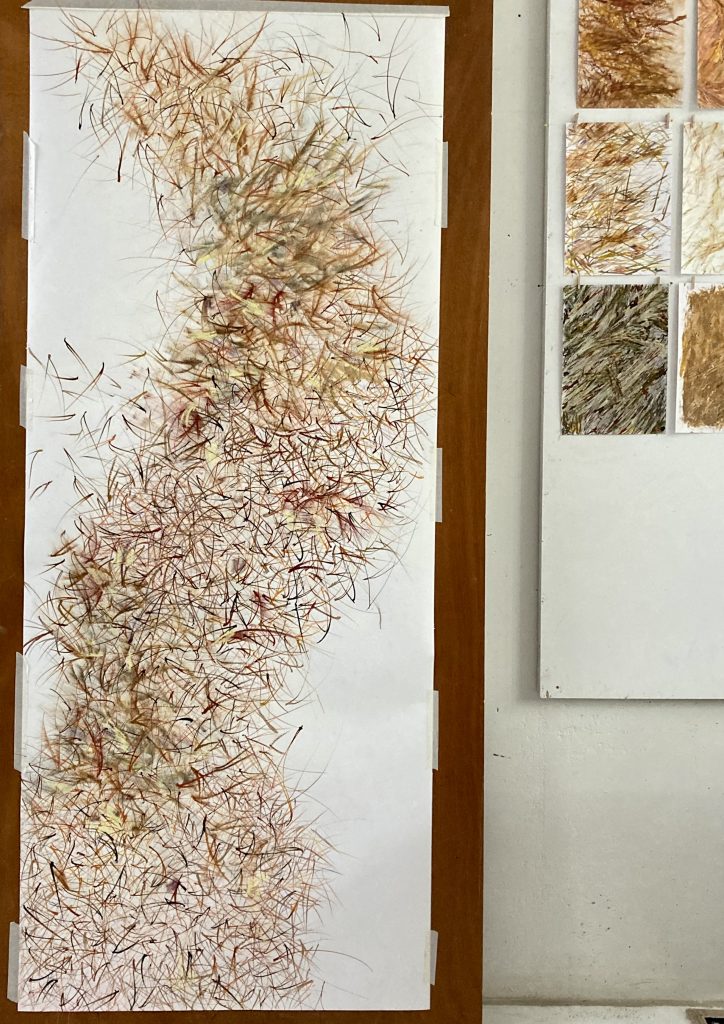 Fouler l’art au pied, craquements, 2025, aquarelle, pastel à l’huile, encre, 200 x 80 cm