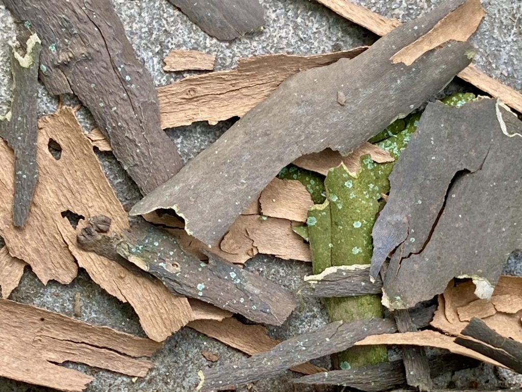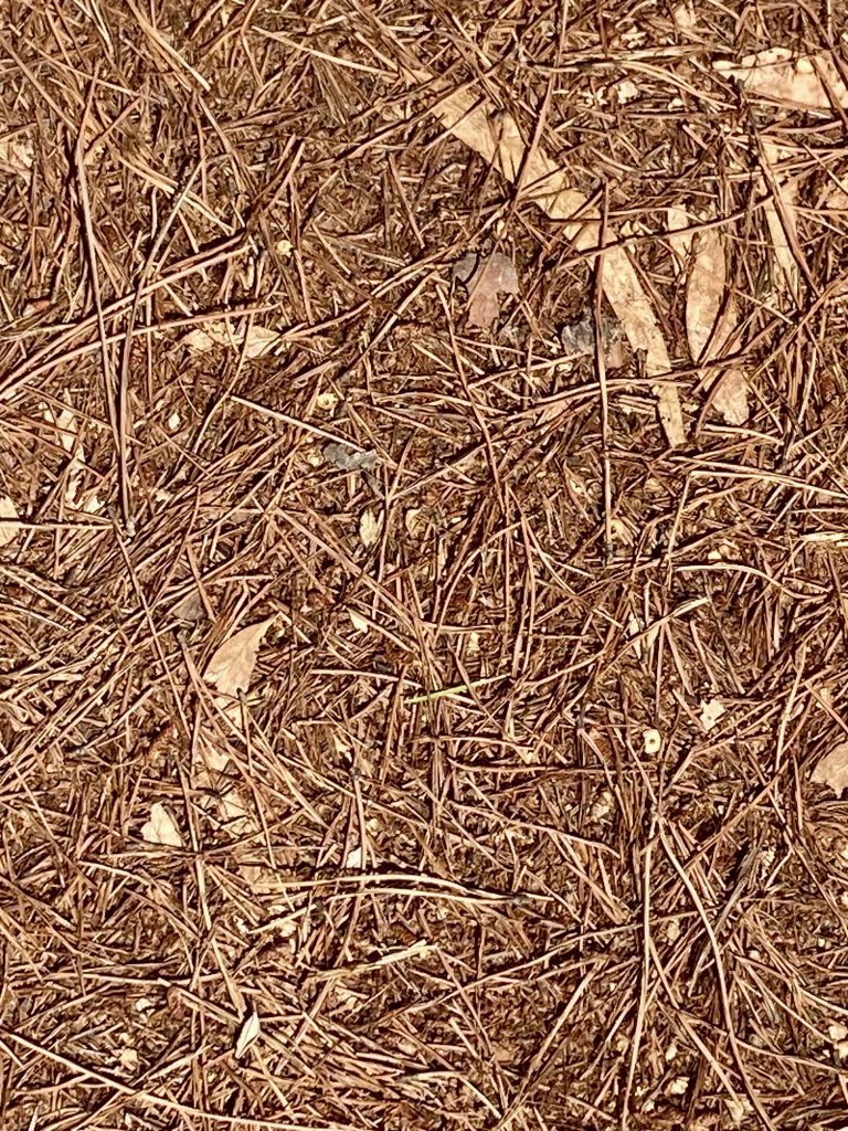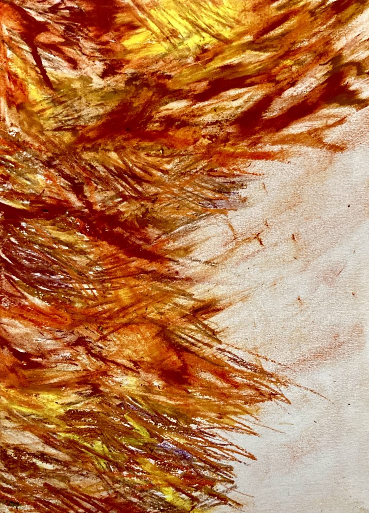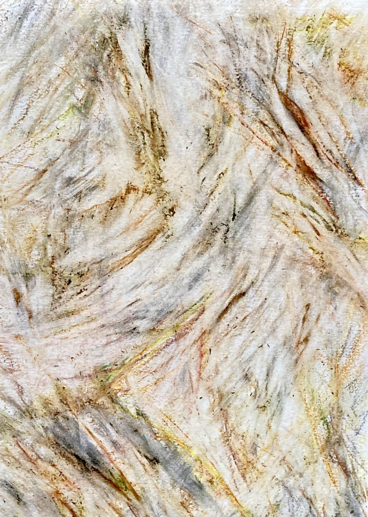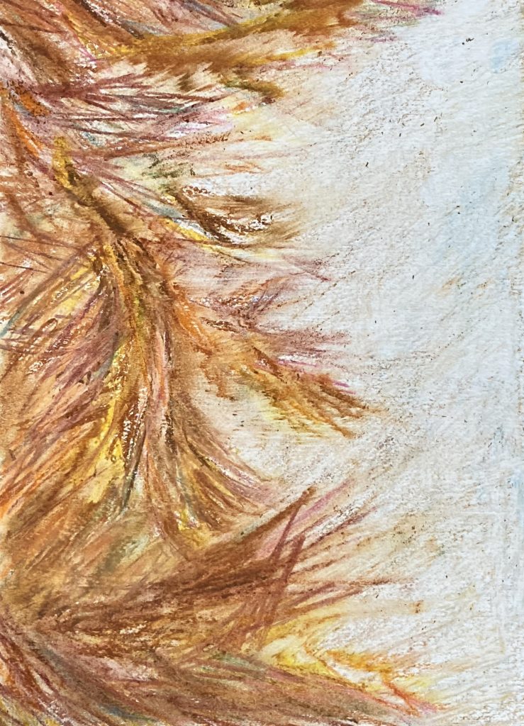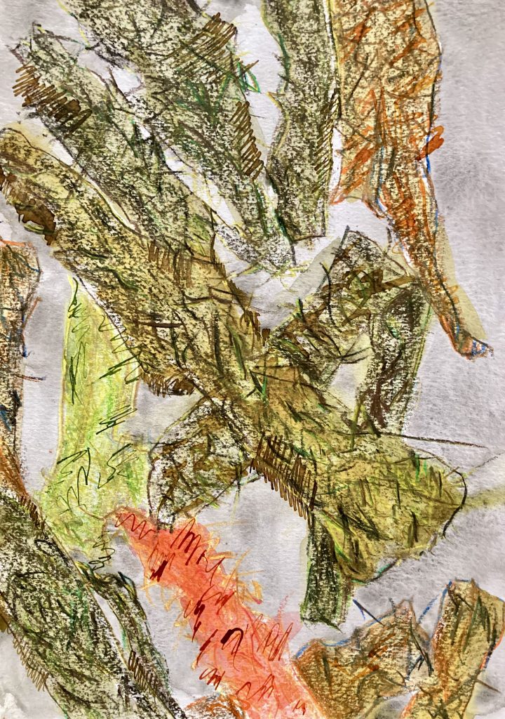 Tentative de visualiser la sensation tactile pédestre, 2024, pastel à l’huile, 21 x 29,7 cmTapis d’aiguilles de pin, photo de mémoire, sentir le glissement des feuilles sous les pieds