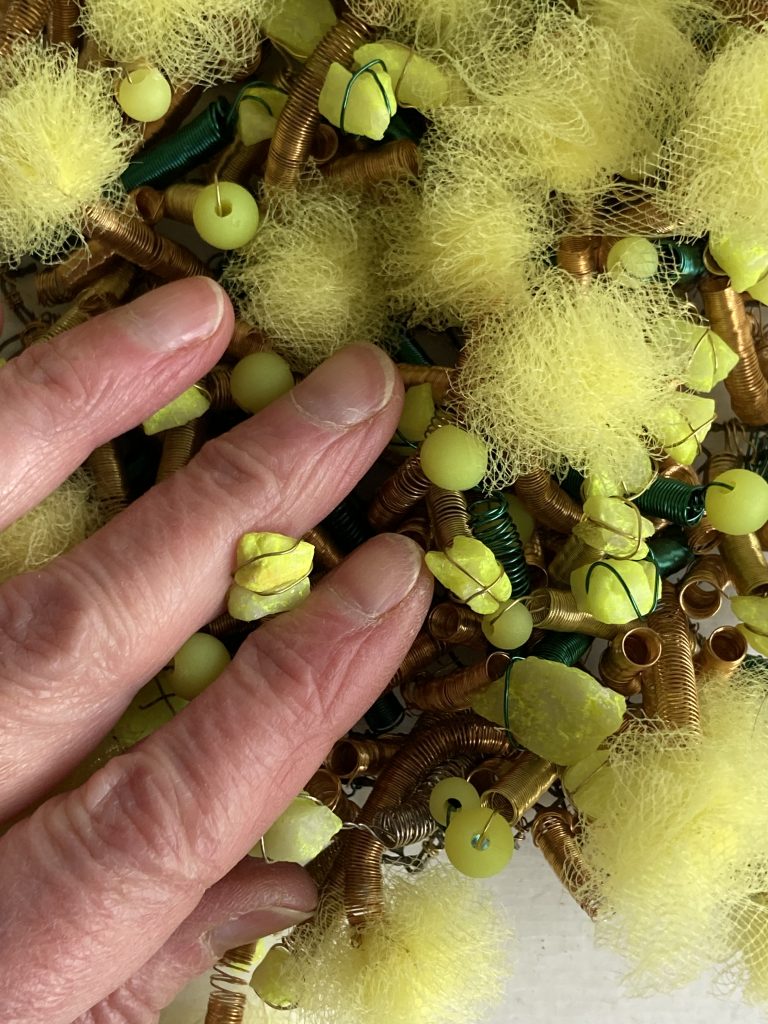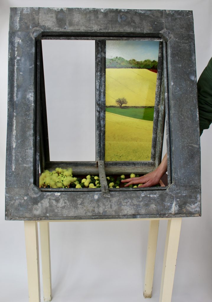 On dit que la peinture est une fenêtre. Je la prends au mot. Je remplace la vitre par une peinture de paysage et sur la table, le toucher de ce paysage en une joaillerie de pompons duveteux, cailloux et ressorts.